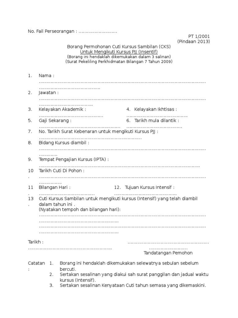 Pt7/2001 (pindaan 2013) borang permohonan cuti kursus sambilan (cks) untuk mensikuti kursus pjj (lntensif)