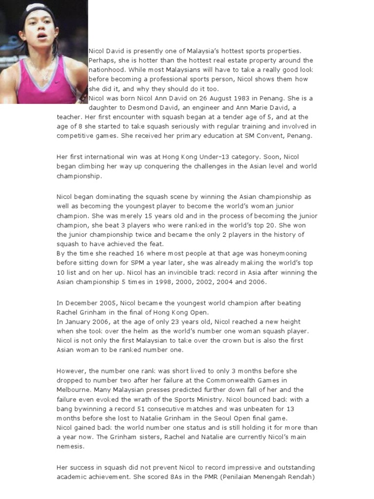 Datuk nicol ann david dan pandelela rinong merupakan idolanya dalam bidang sukan. Nicol menyertai wispa lalu mencapai status profesional pada tahun 2000 apabila memenangi gelaran wispa sulungnya hanya sebulan selepas penyertaannya itu. Nicol ann david i believe we can make it a conscious effort to put a stop to the habit of complaining. Malaysia is truly known for high competition in sports compared to all the countries in the world. 29%(7)29% found this document useful (7 votes).